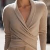 The Draped Cowl Neck Long-Sleeve Top is inspired by the original Draped Cowl Neck Long-Sleeve Top and designed to provide a balanced, tailored silhouette. The fabric has a smooth, supportive feel that maintains structure while allowing natural movement. Visible design elements such as lapel shaping, seam placement, and overall construction contribute to a refined look. This jacket or blazer is worn as a layering piece, making it easy to style over different outfits. It maintains its form throughout the day and works well for work, outings, and occasions where a polished appearance is needed.