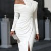 The White Draped Batwing Midi Dress offers a balanced, flattering fit suitable for everyday wear and special occasions. It maintains a clean silhouette and allows comfortable movement.